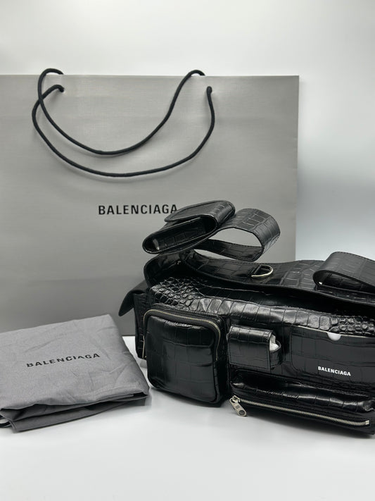 Balenciaga Black Croc Embossed Small Superbusy Sling Bag