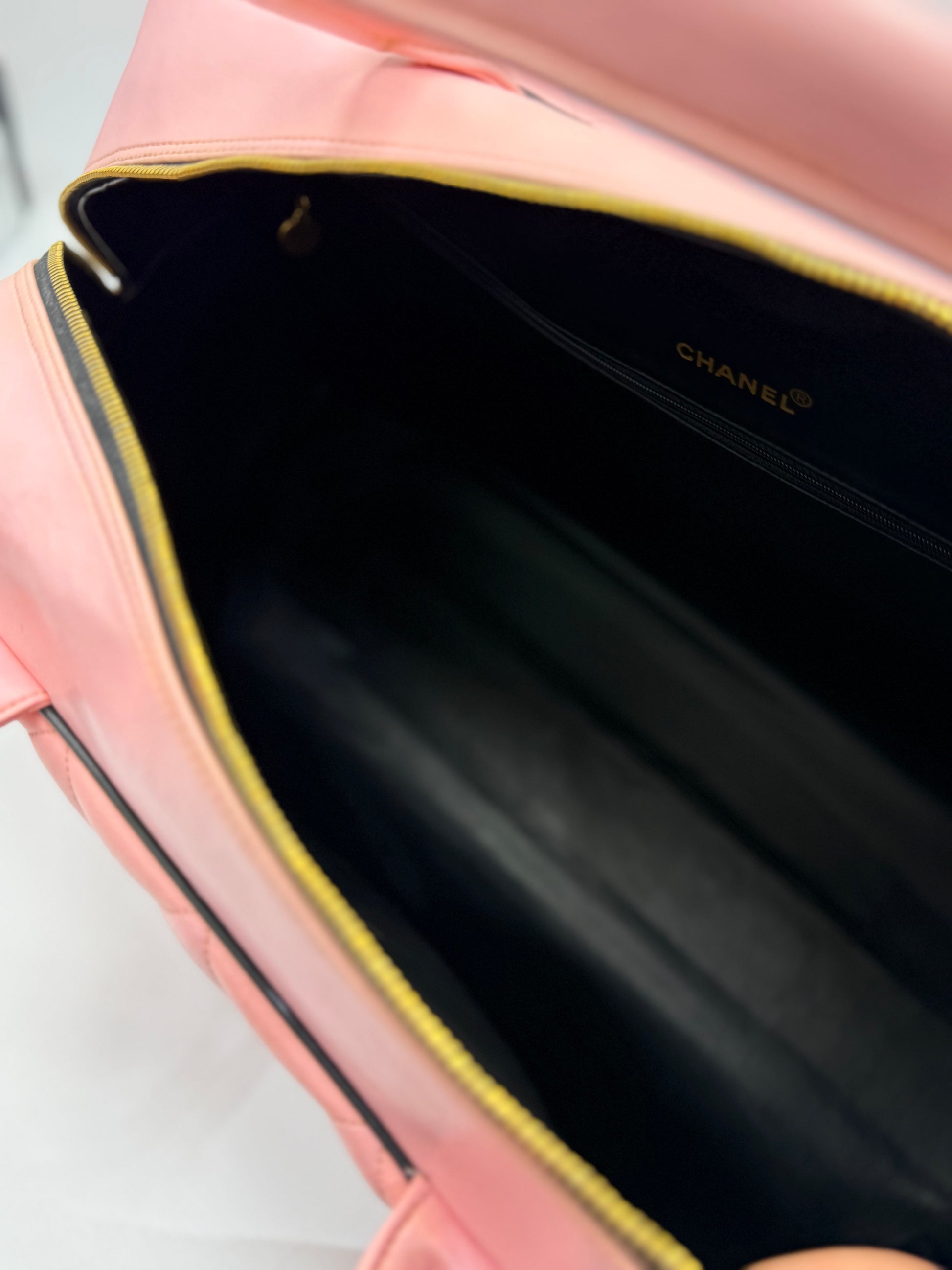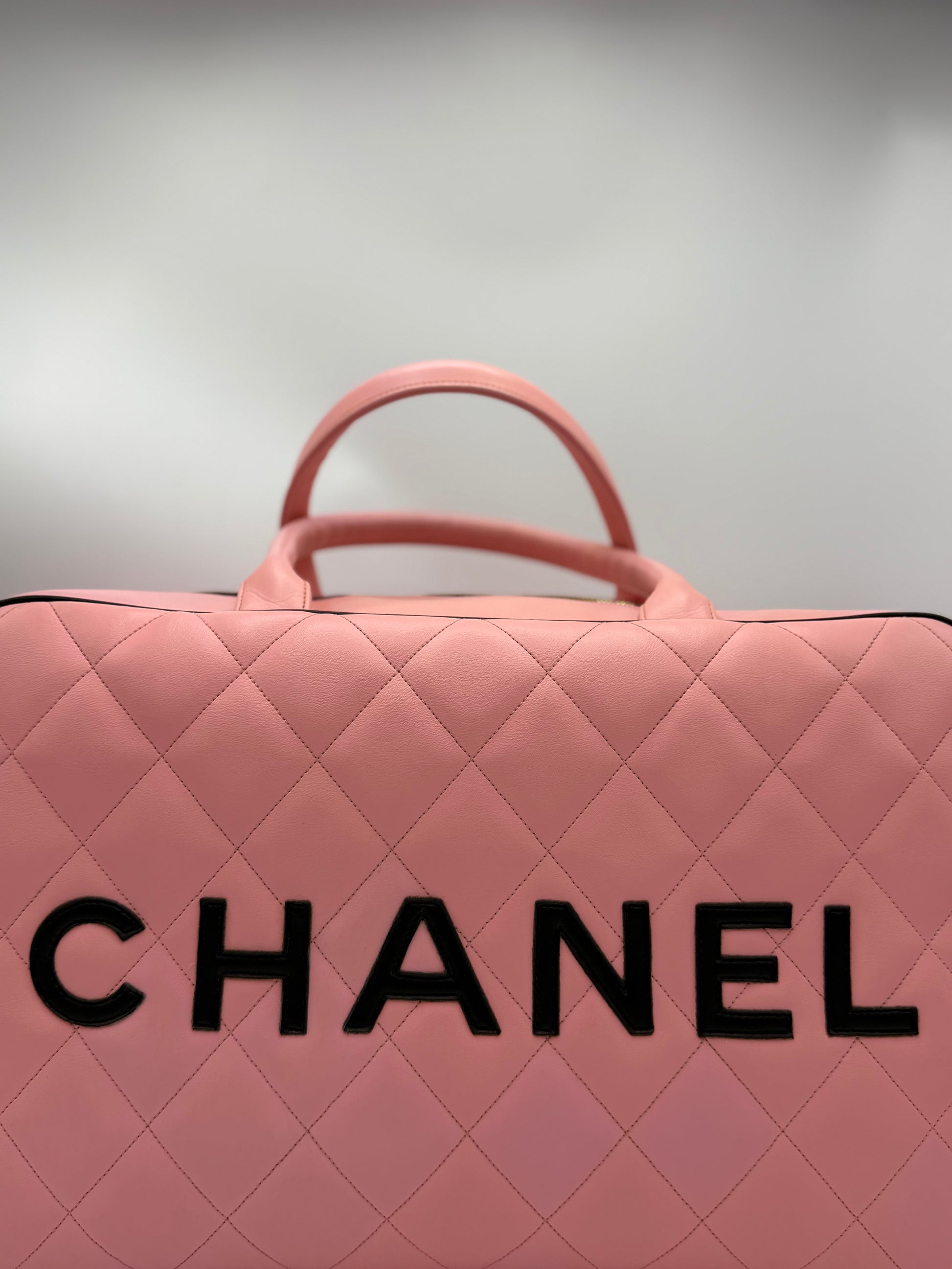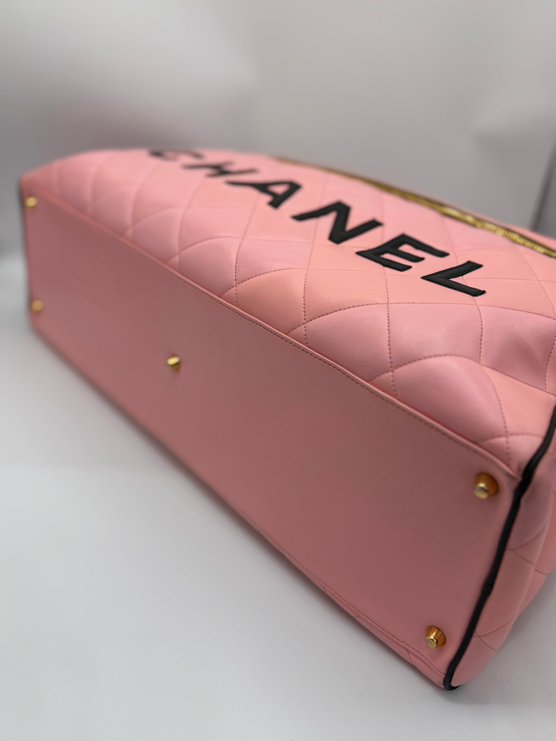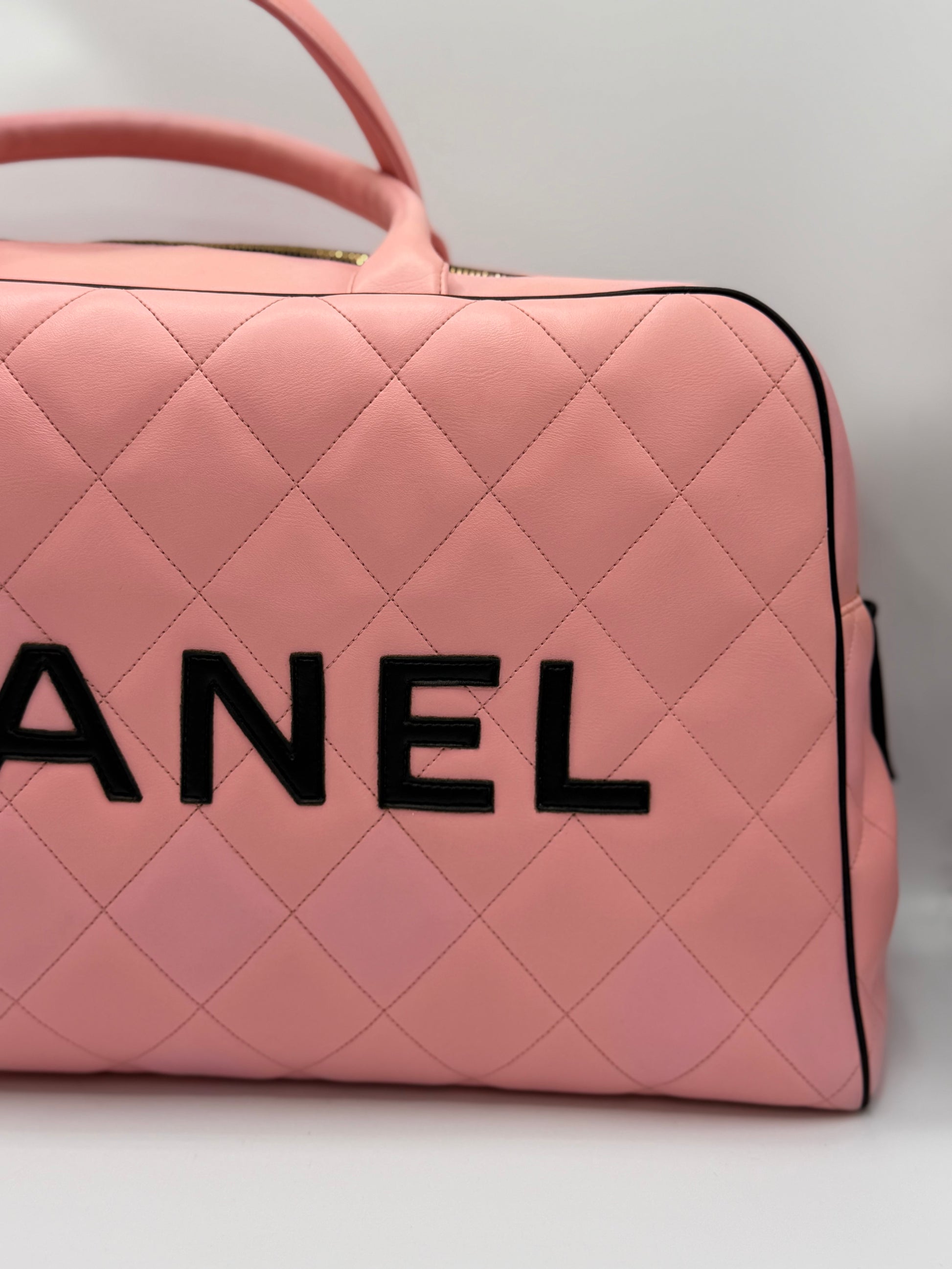 CHANEL 1995 VINTAGE PINK XL DUFFLE BOWLER LETTERED LOGO BAG
